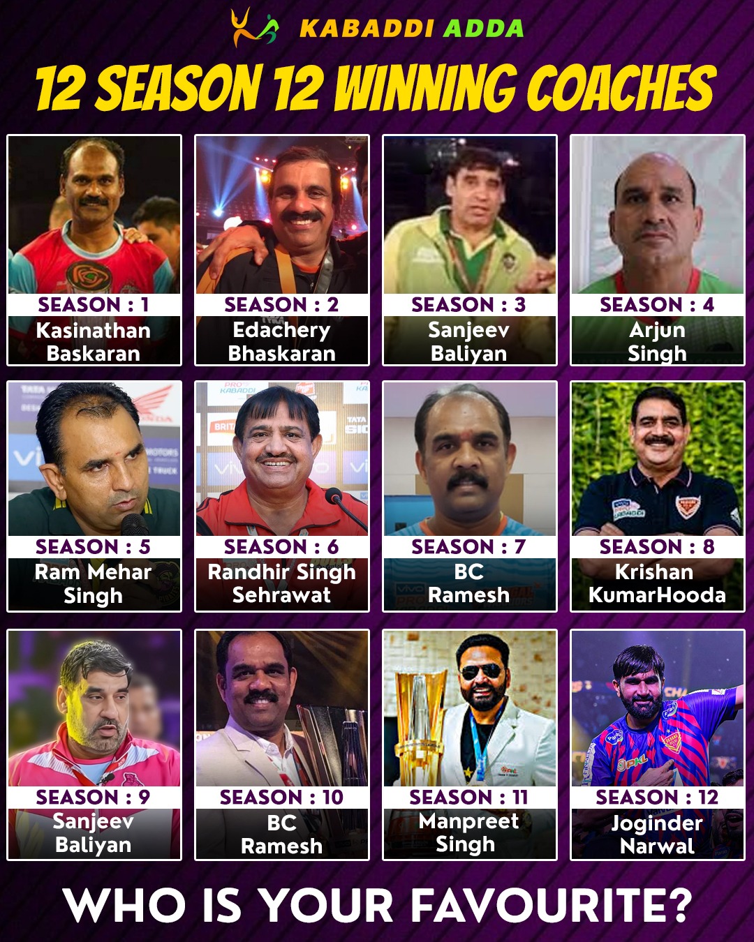 12. Season 12 Winning Coach Joginder Narwal where he guided Dabang Delhi KC to win this title which was led by Ashu Malik.