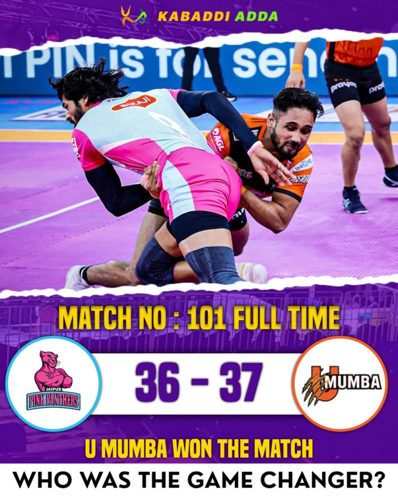 The match between U Mumba and Jaipur Pink Panthers came neck to neck, eventually Mumba won this contest by fine margins.